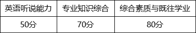 2.综合面试。重点考察考生的思想政治素质和品德考核、专业综合能力、创新潜质和能力、外语能力水平、综合素质评价、心理健康状况等。综合面试一般包括考生自述、考生随机抽题作答、面试小组提问交流、专家评分等环节,考核时长一般不少于20分钟。综合面试满分200分,《面试考核评分细则》见附件3。各部分分值及占比如下: