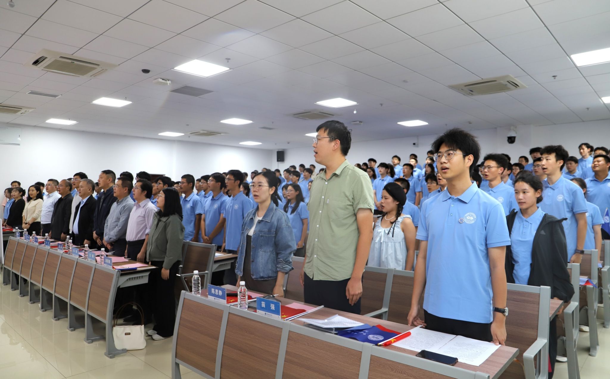 典礼在全体师生齐声合唱《勘探队员之歌》的悠扬旋律中落下帷幕。“是那山谷的风,吹动了我们的红旗……”深情的歌声回荡全场。仪式结束以后,施阳教授结合自身求学和工作经历,为全体新生授开学第一课,他以《漫谈信息物理智能系统的控制问题》为题切入报告,勉励新生努力向学,打牢专业基础,为未来做好充足的准备。